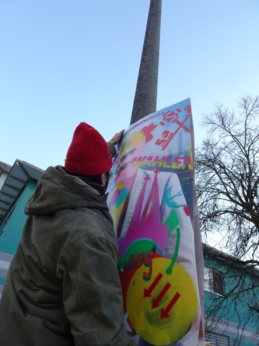 Die Malplakate werden nach der Wahl zu einer Großskulptur zusammengefügt, eventuell mit integriertem Bürgerbüro.