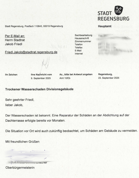 bei einer Begehung des ehemaligen Divisionsgebäudes in der Daimlerstraße 4 mit dem Bürgerverein Süd-Ost, einer Integrationsklasse der Maximilian-Kolbe-Schule Neumarkt und einem Mitarbeiter des Hochbauamts ist uns der “trockene” Wasserschaden in den obersten beiden Stockwerken aufgefallen. Es macht tatsächlich den Anschein, dass die Dachhaut immer noch oder wieder undicht ist. Ich bitte Sie darum, der Sache vetraulich nachzugehen und mich als Stadtrat oder gerne auch den zuständigen Ausschuss über den aktuellen Zustand in Kenntnis zu setzen – gerne auch in nichtöffentlicher Sitzung.