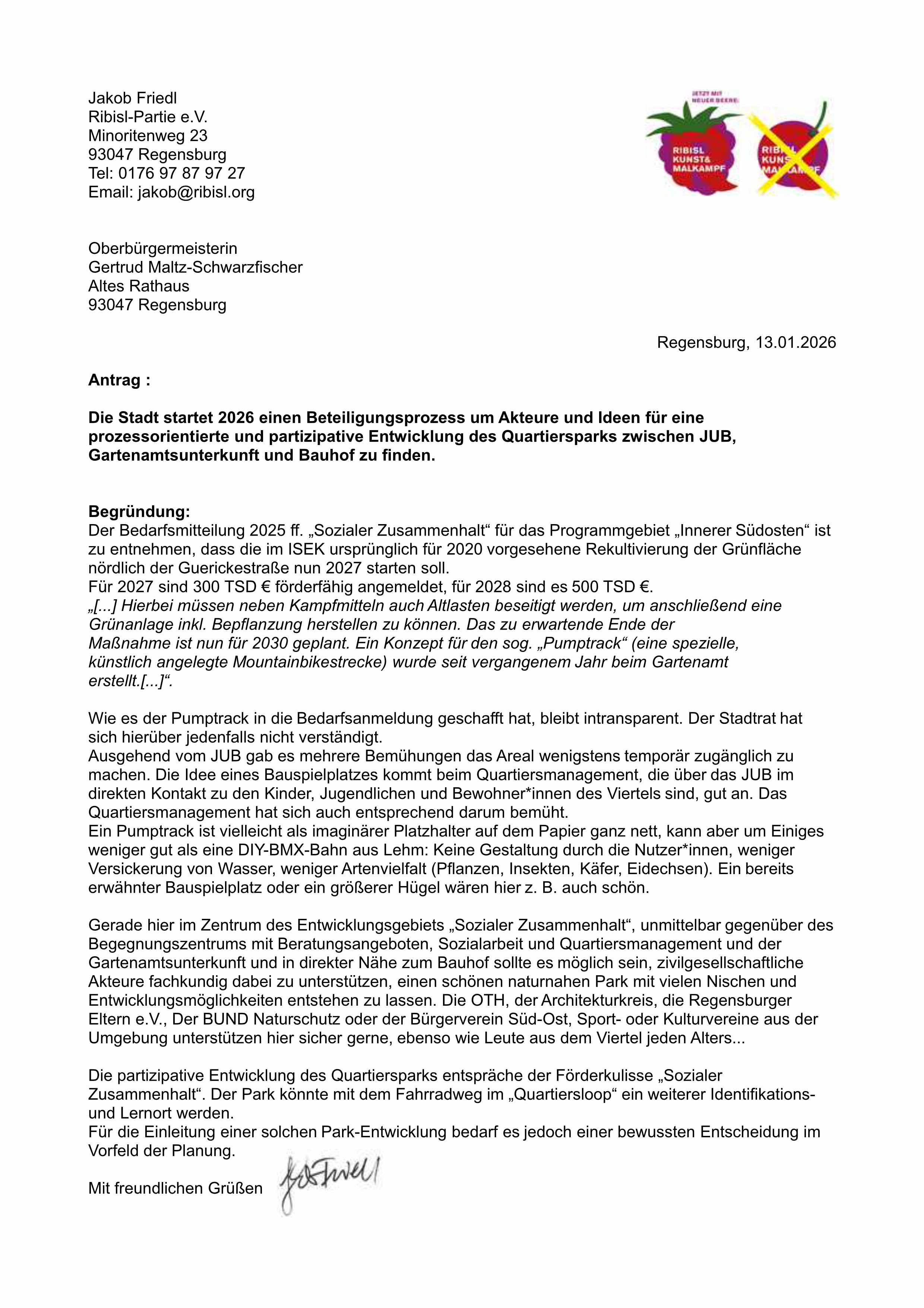 Veröffentlicht am Januar 13, 2026Januar 15, 2026 von jakobQuartieresparkentwicklung und Sozialer Zusammenhalt Antrag: https://ribisl.org/wp-content/uploads/2026/01/Quartierspark_Antrag_Ribisl_13_01_2026.pdf Zum Thema: https://ribisl.org/tag/quartierspark/ Hauptradroute Guericke – Fortsetzung folgt. Maschendrahtzaun für Radroute und Park Zaun zur Bahn beim JuB Guericke LKW-Parkplatz und Ablagerungen im Quartierspark Luftbilder Bahnausbau Außenbereich JuB anschließen